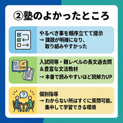 2つ目は英検対策です 。とても手厚く問題の解き方やポイントを分かりやすく教えていただいたことで、入塾前よりも確実に実力をつけることが出来ました 。